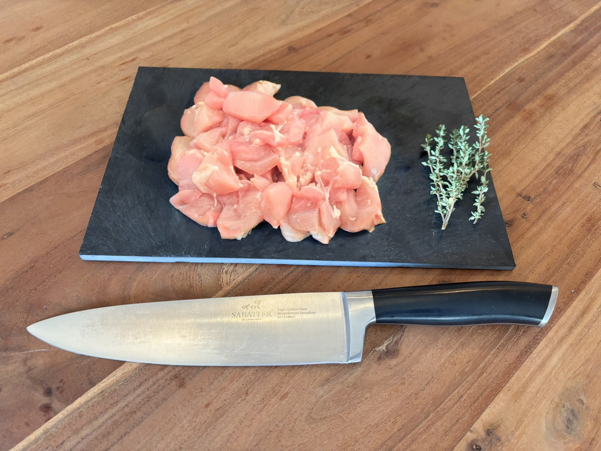 Vers gesneden kippendijblokjes, ideaal voor wok- en stoofgerechten.